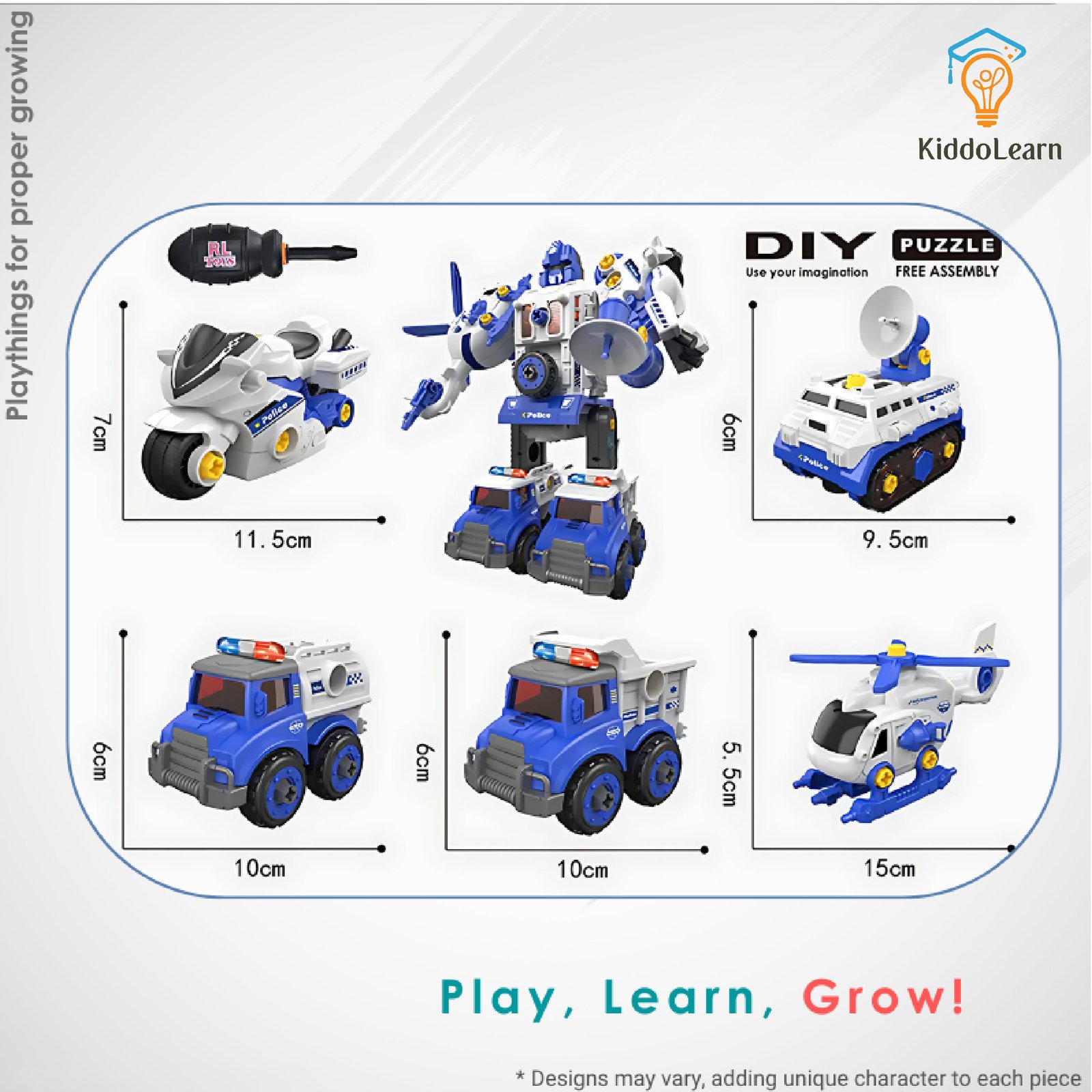 Discover the 5-in-1 Transformers Vehicles Assemble Set, a dynamic robot toy that converts into multiple vehicles. Pack size: 37×32 cm. Perfect for kids who love building and imaginative play. Durable, interactive, and designed for endless fun!