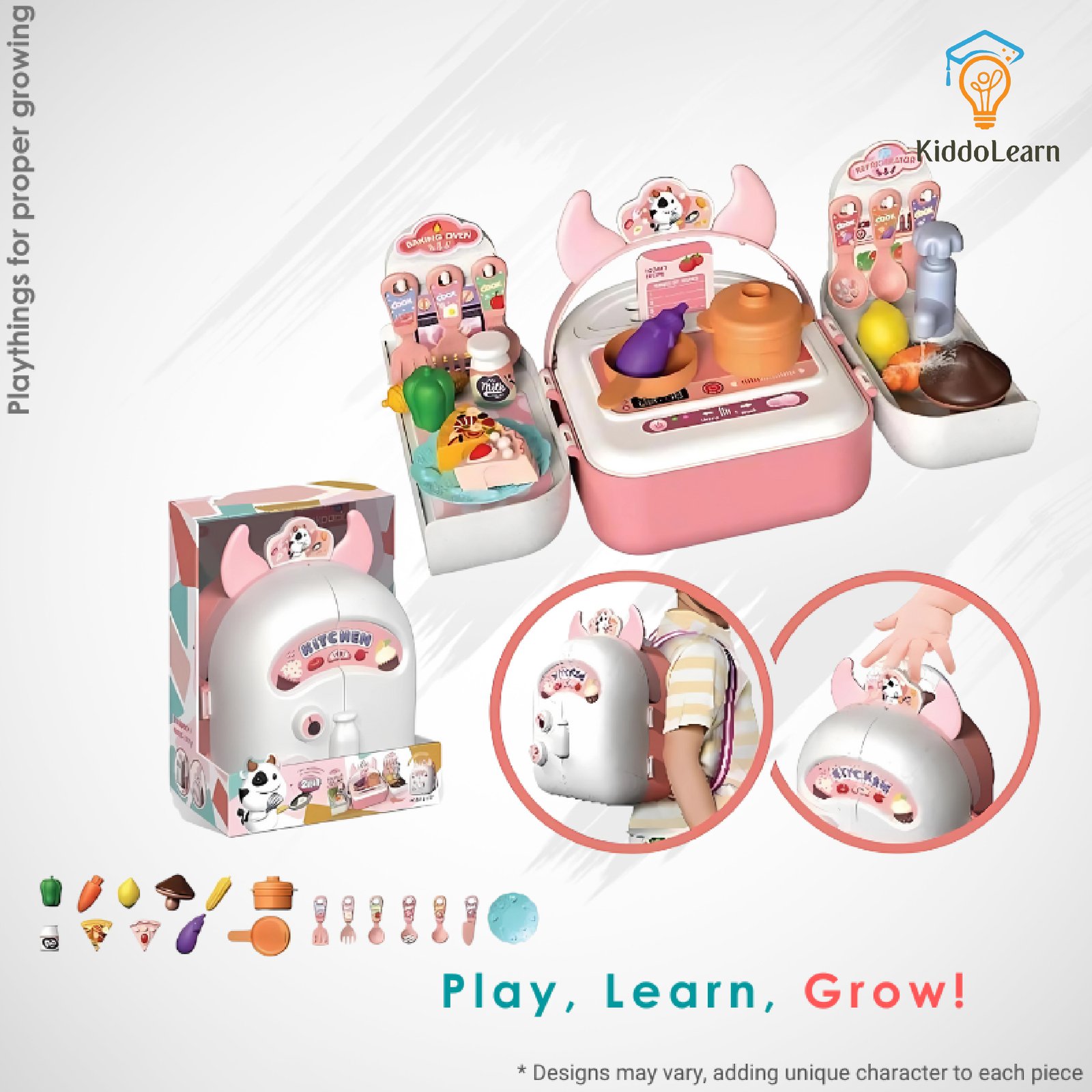 The standout feature of this kitchen set is its clever 2-in-1 design. It effortlessly transforms from a charming cow-themed backpack into a fully functional pretend-play kitchen. When closed, the compact backpack is easy for small hands to carry or wear. Once opened, it reveals a complete kitchen setup, ready for hours of creative play. This seamless conversion makes it a practical and exciting toy for young children who love both cooking and adventure.