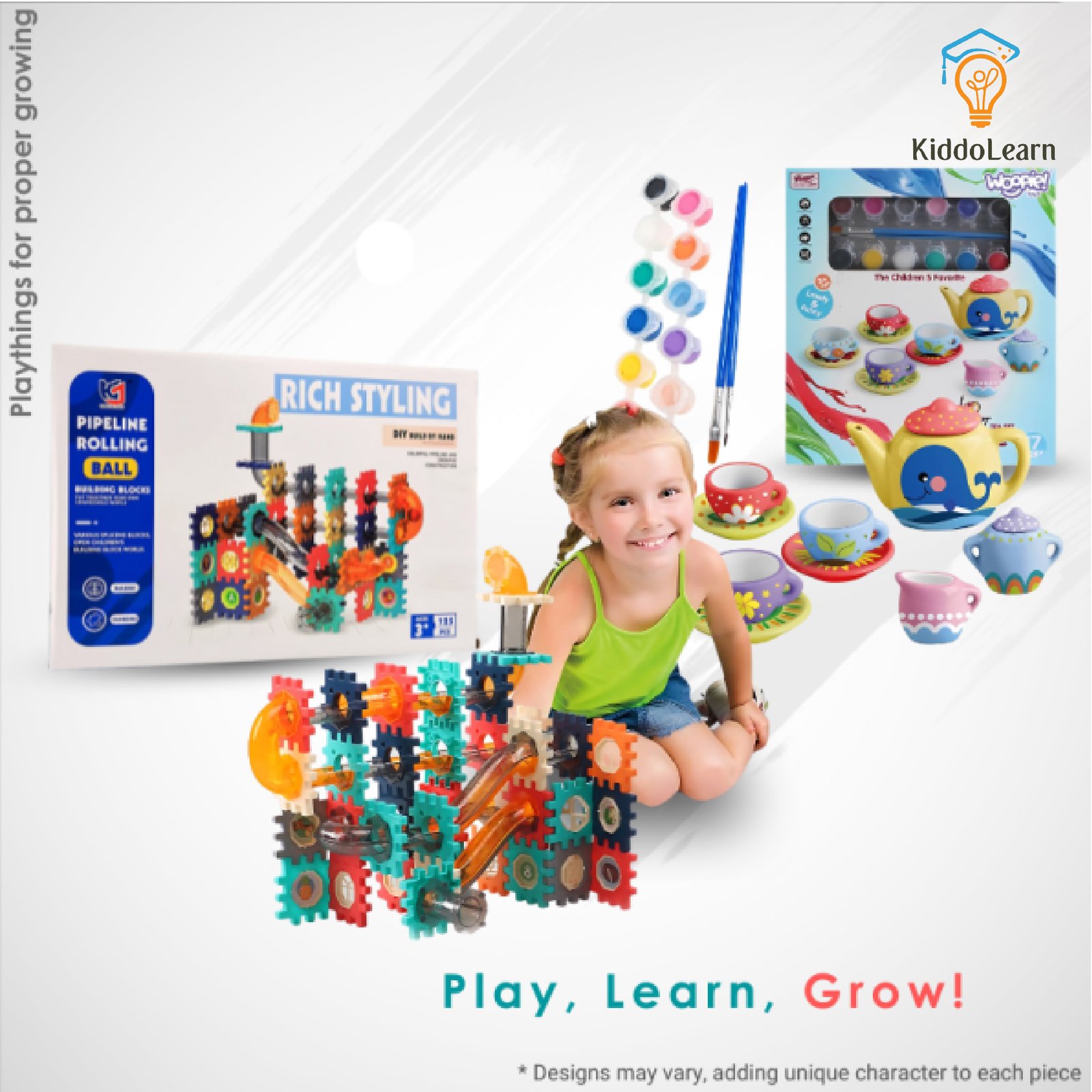 The Fine Motor and STEM Play Development Pack offers a combination of engaging activities designed for young learners. This pack includes a Painted Ceramic Tea Set and a Unique Pipeline Rolling Ball Building Blocks set.