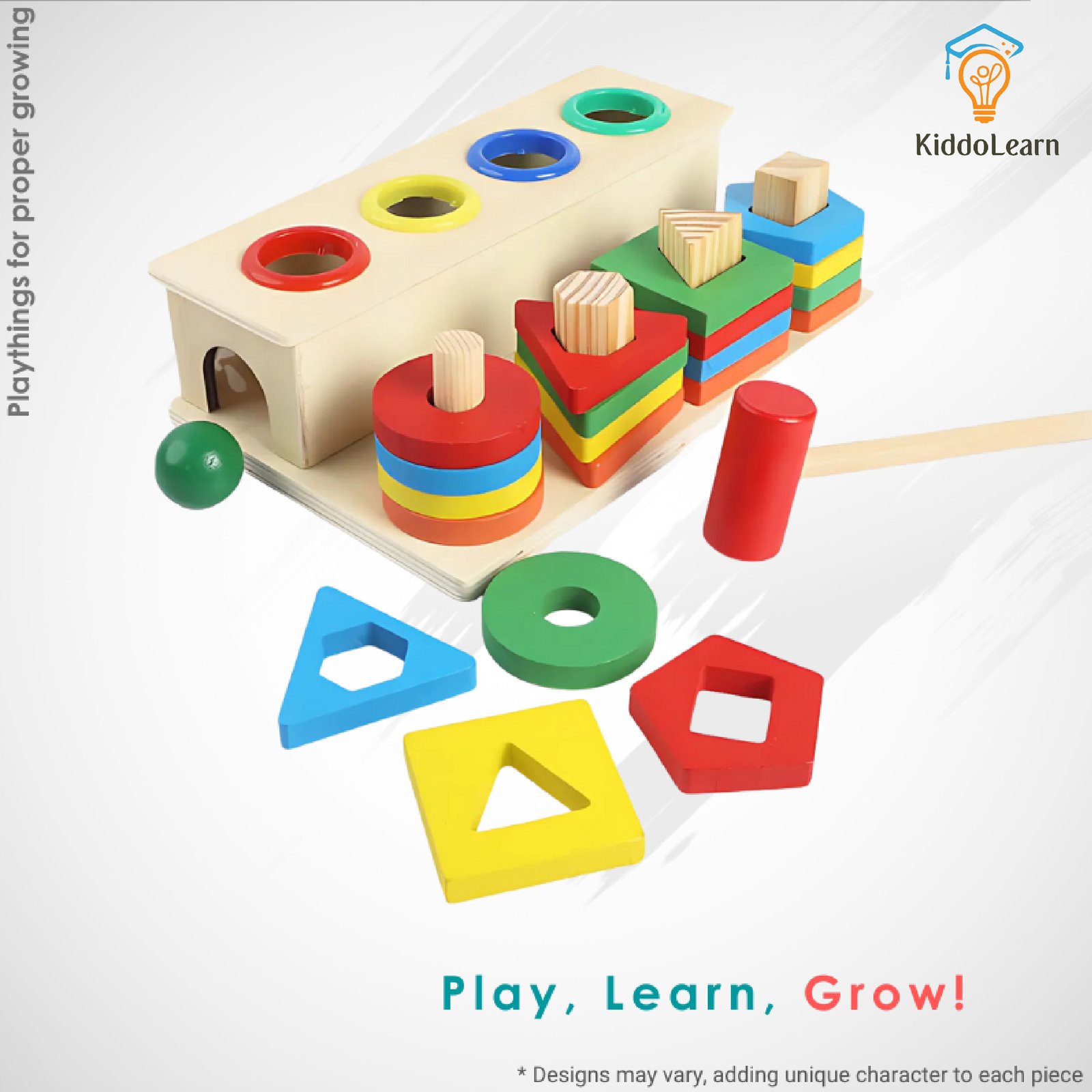 The set features a wooden base with columns and holes, accompanied by colorful blocks and a wooden hammer. Children can practice matching blocks to their correct posts or holes, which helps with shape recognition.